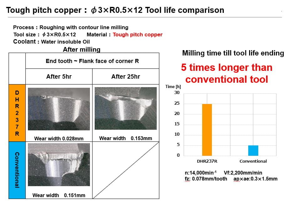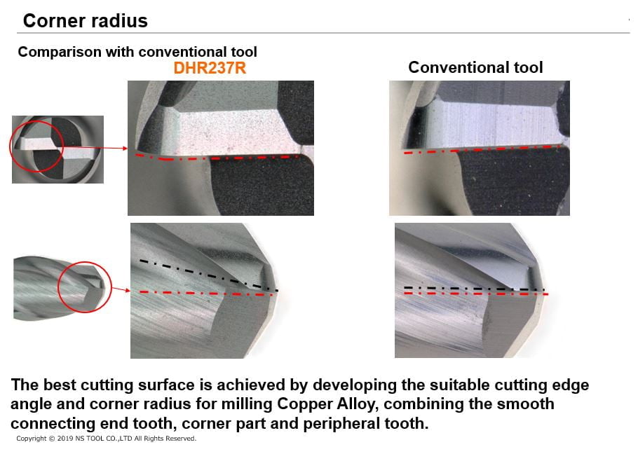 Product & Technology, A New Star, Product & Technology Long Neck End Mill for Copper Electrode DHR237R September 22, 2019 Posted by MEGATECH 20 Sep Share with 銅合金の加工に最適化した刃先角とコーナーラジアス部の採用、そして底刃~コーナー部~外周刃をスムーズにつなぐことで、最良の加工品質を得られます。 面品位を向上させるネジレ角37.5°の設計。 ネジレ角を強くすることで切れ味アップ! 切削抵抗を少なくし、加工面に良い効果をもたらします。