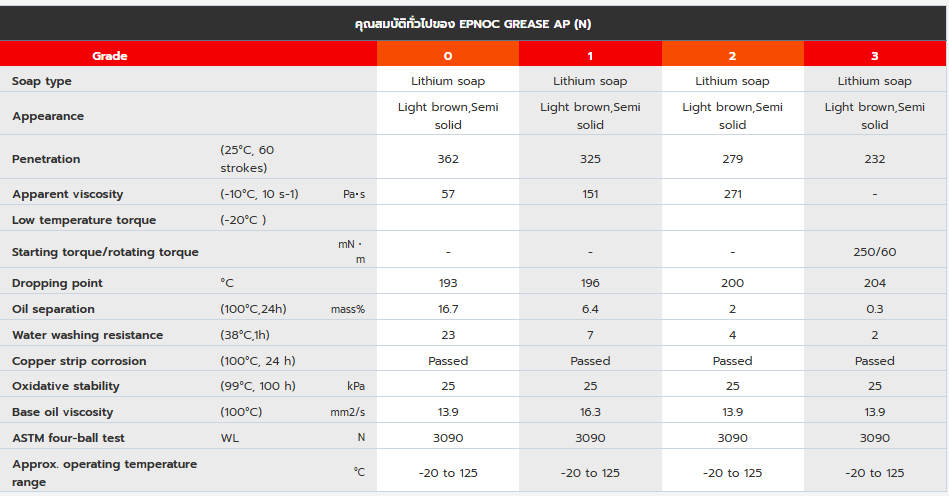 💡คุณสมบัติทั่วไปของ จาระบีลิเธียมอเนกประสงค์ทนแรงกระแทกสูง Epnoc Grease AP (N)