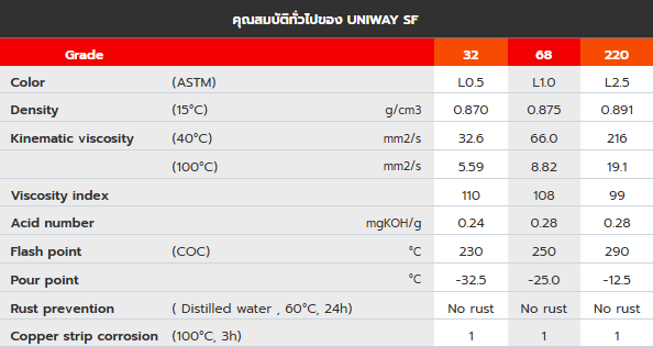 💡คุณสมบัติทั่วไปของ น้ำมันรางแท่น Uniway SF